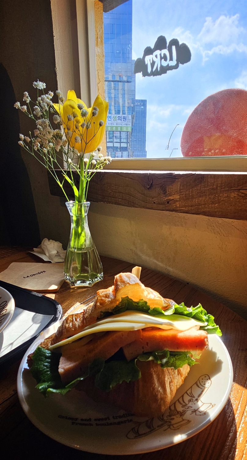 크로와상 샌드위치와 치아바타 그 외 또 맛있어 보이는 다른 빵과 함과 자리에 앉아 시식을 하는데 이것은 빵이 아니고 예술이다